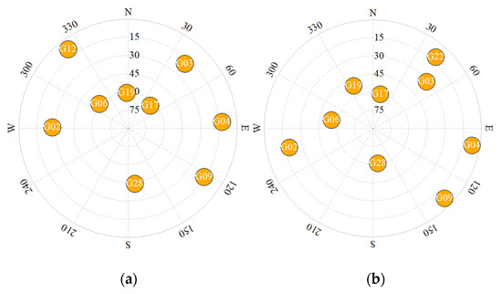 Figure 16), while for the counter-clockwise test, two of the selected satellites are in the north direction while the other one is in the south direction. Thus, the geometrical distribution of satellites is better in the counter-clockwise test than the clockwise test, which leads to smaller PDOP values and higher position accuracy in the counter-clockwise test than the clockwise test. In addition, the variation of the selected satellites in the clockwise test enlarges the volume of the polyhedron that the satellites conducted (see
