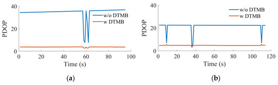 Figure 18, where there is a significant error decrease with the help of DTMB signals. For the clockwise test, the mean position errors decreased from 25.58 m to 6.75 m. For the counter-clockwise test, the mean position errors decreased from 22.34 m to 4.49 m. In addition, large errors occurred at around 60 s in the clockwise test, and 40 s in the counter-clockwise test, which is because of the switch of the visible satellites. Since there is no redundant observation in GPS SPP under such conditions, the position error is tens of meters. However, the position error decreased to several meters with the help of the DTMB transmitter. This is because the GPS satellites are all with high elevation, leading to large PDOP values, and the introduction of DTMB transmitter can decrease PDOP, the corresponding PDOP results are shown in