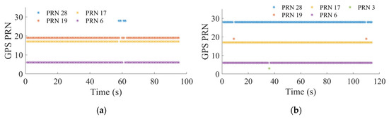 Figure 17, where satellites with PRN 6, 17, 19, 28 are frequently selected because of the high elevation, while satellites with PRN 2 and 3 are selected from time to time when there is no pseudorange observation output from the high elevated satellites at that epoch due to the unlock or multipath effect or signal attenuation.