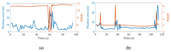 Figure 23. Meter-level position accuracy was achieved in both tests, and the mean position errors are 7.52 m and 4.93 m in the clockwise test and the counter-clockwise test, respectively. The mean PDOP are 11.09 and 5.05 in the clockwise test and the counter-clockwise test, respectively. For the clockwise test, the selected satellites are all in the north direction (see