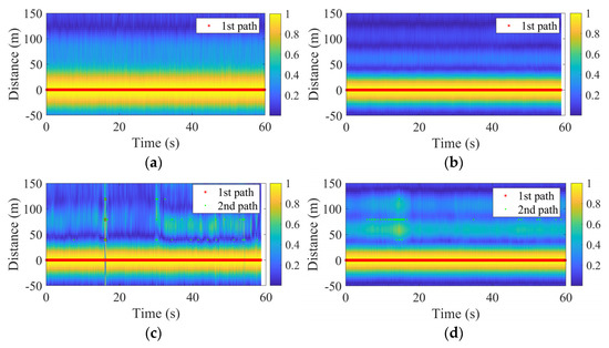 There is no second path detected in channel 17, 21, and 48, which means the receiving condition is quite clear and the channel is stable. For other channels, the second path was detected from time to time because of the variation of the channel. Because the resolution of LS-MP is only one sample, the multipath acquisition results may be different from the CIR results, i.e., the second path was not detected at the bright location of the CIR.
