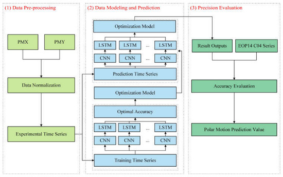 CNN and LSTM have unique characteristics in the process of time series prediction. CNN can extract and optimize features related to polar motion and LSTM can predict future data based on the long-term historical time series data. This section describes a hybrid CNN–LSTM model for polar motion prediction to improve the prediction accuracy. The polar motion prediction processes are divided into three main parts: data pre-processing, data modeling and prediction, and accuracy evaluation. As shown in Figure 4, the polar motion time series are entered in the first step and pre-processed by data normalization. Then, the polar motion time series are divided into two parts: the first part is used as training data to obtain an optimization model, and the second part is used as prediction data to obtain the polar motion time series by the optimization model. In the final experiment, accuracy indicators are used to evaluate the prediction model.
