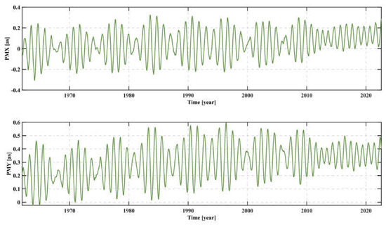Polar motion time series from 1 January 1962 to now (MJD: 37665-59793); PMX, PMY represent the x and y components of polar motion series respectively.