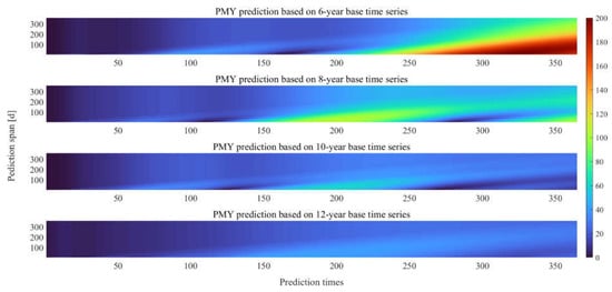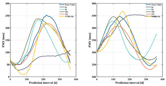 Figure 8 and Figure 9 show the mean absolute error (MAE) of 360-day polar motion prediction using the EOP 14C04 series for the period 1 January 2009 to 31 December 2020. PMX and PMY with 6-year base time series show large errors, especially for medium- to long-term prediction (180–360 days), which is mainly due to the poor training effect caused by the short time series. At the same time, we found that the 12-year base time series had the highest prediction accuracy, mainly due to the fact that the prediction accuracy can be optimized when the length of the base time series is sufficient.