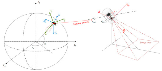 Aerial remote sensing images can also calculate the corresponding geographical position of pixels through coordinate transformation. Aerial remote sensing images are usually obtained by cameras and other optoelectronic loads mounted on unmanned aerial vehicles (UAVs). Unlike satellites with fixed orbits, cameras loaded on UAVs can image the ground at any position and any angle, making image registration more difficult. For the same reason, the auxiliary coordinate system used to calculate the target position is also different from the satellite. The geographic coordinate system is used to replace the geocentric inertial system, and the carrier coordinate system is used to replace the orbital coordinate system to achieve the coordinate conversion process. In addition, the installation method of a UAV’s camera is also different from that of satellite remote sensing cameras. Most spaceborne cameras use a rigid connection with the satellite to image the ground, and squint imaging mainly depends on the satellite side sway and two-dimensional turntable. UAVs can achieve squint imaging by attitude control, while large UAV cameras are usually installed on a frame composed of two Cardan shafts to achieve wide-area remote sensing imaging.