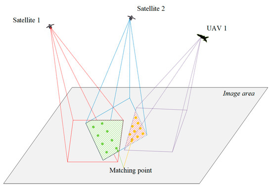 After obtaining the geographic location information in the image, the next step is to achieve image registration by solving the corresponding pixel location. When the images to be registered come from different remote sensing loads, the ground areas corresponding to the two images are not always identical. To achieve registration between two remote sensing images, it is necessary to select more than three non-collinear target points in the image overlap area for registration. The more registration target points are selected, the higher the registration accuracy. Since the registration method based on the geographical location proposed in this paper does not need to take the impact of image features and textures into consideration, it only needs to select registration points evenly in the overlapping area, as plotted in Figure 4.