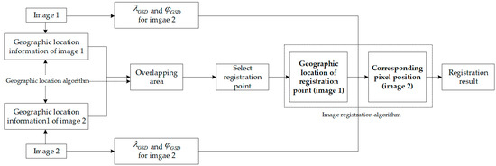 Based on the above algorithm, the corresponding pixel positions of a pair of registration points A can be obtained through pixel geographic location solution and spatial coordinate transformation. The calculation process should be repeated for all the registration points to obtain the corresponding relationship between the two images. The overall algorithm flow is shown in Figure 6.