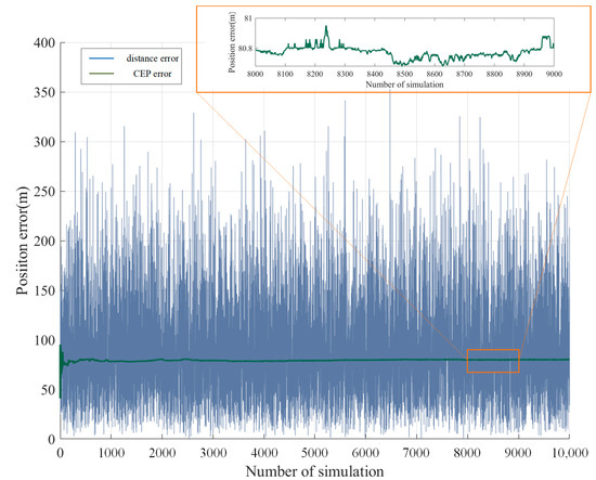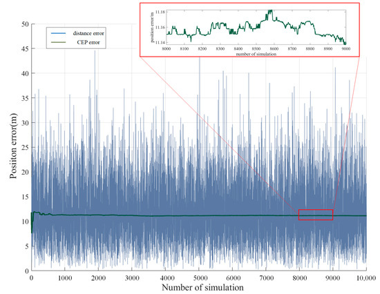 Another key index to evaluate the positioning accuracy in multiple simulation analyses is the circle probability error (cep), which is shown in Equation (30)