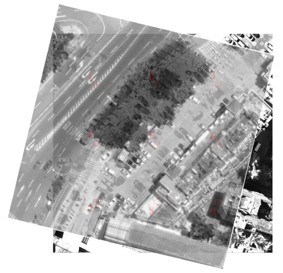 First, two images were registered using the algorithm proposed in this paper. Nine groups of registration points were selected in the images, and the two images were registered by the algorithm proposed in Section 2 and Section 3. The corresponding positioning results and registration errors are recorded in Table 5. The geographic location information in the table was calculated according to the satellite remote sensing images to be registered. The projection position (UAV) is the ideal projection position of the point to be registered in the UAV remote sensing image calculated by the above algorithm. The registration error refers to the pixel deviation between the ideal position and the actual projection position. The registration accuracy can be represented by the spatial distance between the pixel position calculated by the algorithm and the standard position of the point to be registered.