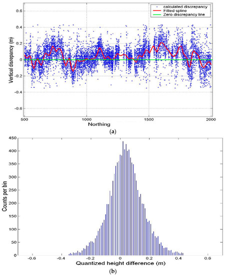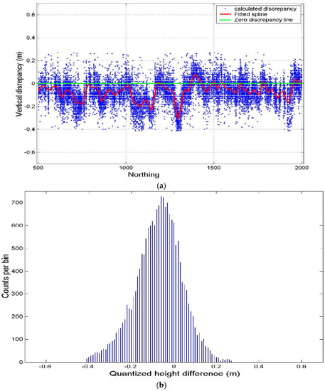 Figure 6a shows the discrepancy behavior with respect to time (North–South direction) and Figure 6b shows the histogram of the computed discrepancy for the overlap region between strips 1 and 2. In this overlap region, the average relative offset was 0.04m, which means the left data strip (strip 1) was higher in average than the right-hand strip (strip 2). On the other hand, Figure 7a,b show the relative height offset between strips 7 and 8 where the left strip (strip 7) seems to be below the right-hand one (strip 8) over most of the overlap region.