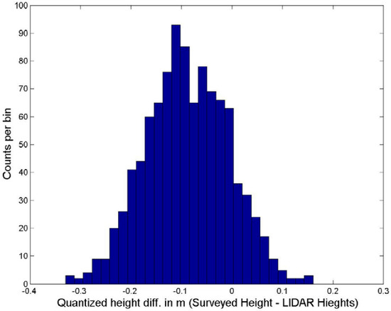 Direct differencing was applied to compute the discrepancy between the two data points from the laser and ground, i.e., the laser height was subtracted from the ground interpolated height. More than a thousand such differences were computed. Figure 8 shows the histogram of those differences. The histogram shows a bias in the differences of −0.088 m with a standard deviation of ±0.082 m. Hence, the average height of the laser data points included in the test is higher than the estimated ground by 0.088 m. Consequently, the total RMSE of the LIDAR heights from the surveyed ground (zero in the histogram) was 0.12 m with a mean value of zero. The calculated statistical characteristics represent only a small sample of the data. The tested area covers less than 2 s of collection time (about 19,000 data points since the designed scanning rate is 10,000 points/s). The 19,000 data points represent a small portion of the whole data set which is more than 3,000,000 data points. However, only 1008 points were included in the real computation since it is not practical to survey more points on the ground.