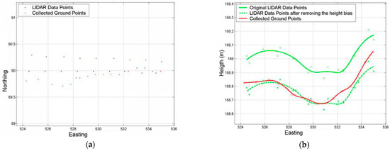 Eight positions were identified and used in obtaining the planimetric accuracy. Six of those locations were used to compute the offset in the X (Easting) direction and the other two were utilized to compute the offset in the Y (Northing) direction. In each of these locations the data points from both data sets, LIDAR and ground, were identified as shown in part (a) of Figure 9, Figure 10 and Figure 11. Parts (a) of these figures show the plan view of the points. From each set, an estimate of the two shifts was made to realize the coincidence. The idea here is to translate these two curves and obtain the shift that will maximize the match. Prior to that, the height bias should be removed in order to exclude its effect in the matching. In part (b) of the figures, the green dashed curve represents the LIDAR data after removing the height bias between the two data curves.
