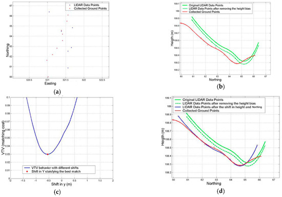To get the best match between the two curves, the LIDAR data curve will be shifted gradually around the ground data set in the direction of the computed offset (X as in Figure 9 and Figure 10, and Y as in Figure 11). The shift search window ranged from −2 m to 2 m with an increment of 0.01m. At each increment, the discrepancy in Z of each ground point and its interpolated-correspondence point from the LIDAR curve data is computed. The sum of the squares of these offsets is considered as the matching cost at each location. Parts (c) of the figures show the matching cost function behavior with respect to different shift values. At the minimum matching cost, which is associated with the best match between the two curves, the corresponding shift is obtained. Parts (d) show the original data curves, after removing the height bias, and after the planimetric shift.