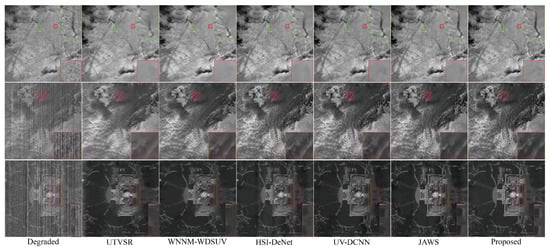 | UTVSR | WNNM-WDSUV | HSI-DeNet | UV-DCNN | JAWS | Proposed | |