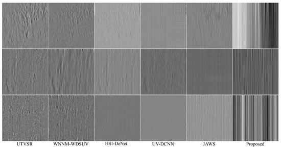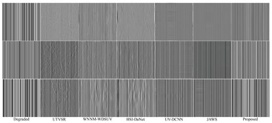 - Sparsity-based priors: These methods viewed that the image especially the stripe is sparse, so different priors, such as gradient-based variation, dictionary-based learning, and low-rank recovery, are combined to constrain the models for pursuing the optimal approximate solution. For instance, Huang et al. [56] proposed a uniform mixed noise removal model by the employment of joint analysis and weighted synthesis sparsity priors (JAWS). Chang et al. [57] employed unidirectional total variation and sparse representation (UTVSR) to simultaneously destripe and denoise remote sensing images. Xiong et al. [58] proposed a spectral-spatial gradient regularized low-rank tensor factorization method for hyperspectral denoising. Zheng et al. [59] removed mixed noise in hyperspectral images via low-fibered-rank regularization. Liu et al. [60] used the global and local sparsity constraints for a unified model construction to simultaneously estimation intensity bias and remove stripe noise in noisy infrared images. Zeng et al. [61] proposed a hyperspectral image restoration model with global L spatial-spectral total variation regularized local low-rank tensor recovery. Xie et al. [62] denoised hyperspectral images via non-convex regularized low-rank and sparse matrix decomposition. Hu et al. [63] proposed a restoration method that can simultaneously remove Gaussian noise and stripes using adaptive anisotropy total variation and nuclear norms. Wang et al. [64] presented a Hybrid total variation model for hyperspectral image mixed noise removal and compressed sensing. Wang et al. [65] exploited nonconvex logarithmic penalty for hyperspectral image denoising. These methods pursued their exciting denoising performance at the cost of expensively computational complexity.
