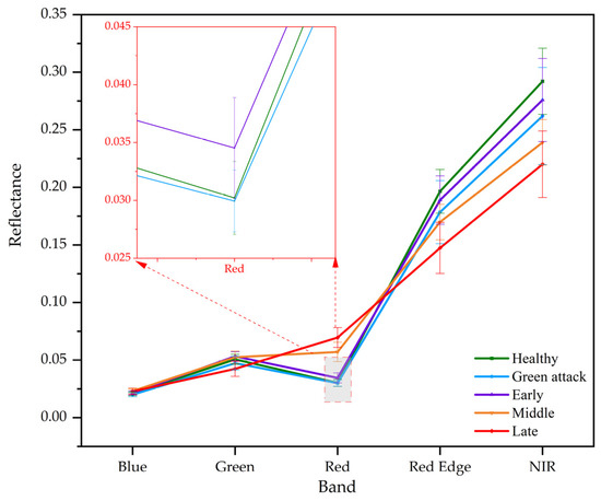 3.2.1. Spectral Characteristics of Trees at Different Infection Stages