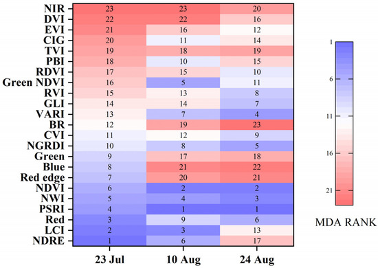 | BR | Blue ratio | (ρRed/ρBlue) × (ρGreen/ρBlue) × (ρRed Edge/ρBlue) × (ρNIR/ρBlue) | [51] |