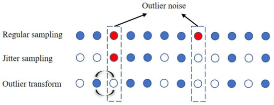 The outlier mask replacement strategy. The red dots represent outlier traces, the blue dots represent sampling traces, and the hollow dots represent unsampled locations.