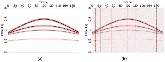 Synthetic data. (a) A noise-free common-shot gather. (b) Noisy gather with random and outlier noise (SNR = −5.25 dB, PSNR = 12.47 dB).