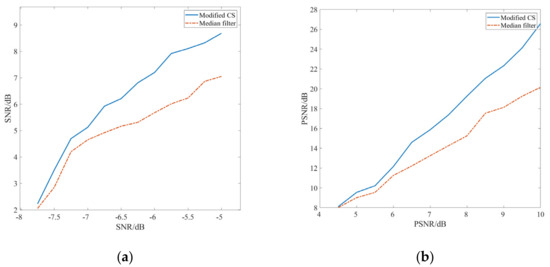 The noise-free synthetic data are shown in Figure 3a,b, with the data of random and outlier noise. The SNR of the noisy data was −5.25 dB, and the PSNR was 12.47 dB. We first applied the proposed method for noisy data to construct the outlier mask matrix. Figure 4a,b show the two kinds of standard deviation distributions of the data with outlier noise, and the threshold was calculated by To proposed previously. There was an apparent difference between outlier noise and effective signals. For this dataset, 1 ≤ To ≤ 3 was a good range to distinguish outlier traces. We designed the outlier mask matrix based on the To value, and used a combination of the strategy and the jitter matrix in this research, as shown in the Figure 5a matrix. The mask matrix was then used to interpolate the data with outlier noise (Figure 5b). Figure 6 shows the denoising results using a traditional median filter and the proposed method. Figure 6a,b show the median filtering results and the corresponding noise. The filter length of the median filter was three. Although the outlier and random noise were removed, there was strong signal leakage in the noise (Figure 6b). The missed data of the outlier traces removed by the mask matrix was reconstructed by CS (Figure 6c). The SNR of the reconstructed results was 8.42 dB, and the PSNR was 25.72 dB. Random and outlier noise were well suppressed, and the difference showed that reflection signal were not leaked (Figure 6d). From single-trace analysis (Figure 7), we see that the signals were not destroyed before and after denoising, and that the amplitudes became normal after removing the outliers. Based on the median filtering and the proposed method, a stability test of multiple SNRs and PSNRs was carried out (Figure 8). From the results, it can be seen that as the noise increased, the denoising effect also decreased, but the proposed method still had great advantages over traditional methods.