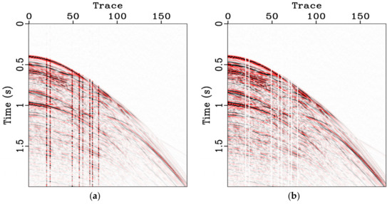 Mask jitter matrix. (a) The 50% jittered undersampling matrix (removed outlier trace). (b) The decimated synthetic model with 50% removed traces (with outlier noise).