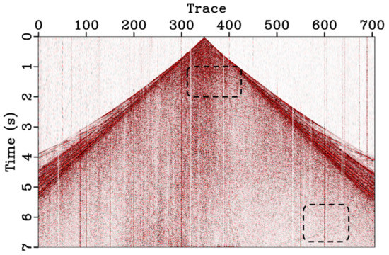 Outlier noise usually refers to one or a group of waveforms that are significantly different from the effective signals in terms of amplitudes [26]. Outlier detection has been widely adopted in many fields, including medical diagnosis, weather forecasting, intrusion detection systems, and fraud control. In seismic data processing, the occurrence of outliers leads to large errors in the overall statistics of the data, especially in the prediction filter and least squares denoising [27]. Since the characteristics of seismic data are commonly different from pictures, image-related signal processing methods cannot be directly applied to seismic data. Thus, according to the Z-Score and modified Z-score in traditional image processing, it is difficult to effectively suppress the outlier noise of seismic data. In seismic data processing, median filtering has been used to suppress outlier noise, but signal leakage is inevitable. Gemmeke et al. [28] used an over-complete dictionary of clean speech samples to find the sparsest sample combination that jointly approximates the non-missing features of noisy signals, and replaced missing samples with linear combinations of clean speech samples. Gholami and Sacchi [29] proposed two sparsity-based deconvolution methods in the time and frequency domains where the outliers are ignored, while generating solutions with isolated spikes. Zhao et al. [30] designed a filter that jointly minimizes the L2-norm of the random component and the L1-norm of the irregular noise. The computational complexity of sparse-domain filtering is several times larger than that of traditional sparse threshold methods. Jeong et al. [31] proposed a local outlier detecting factor (LoOF), which can separate the source interference noise in a homologous acquisition. Chen et al. [32] proposed a robust residual dictionary learning method to retrieve reflection signals from leaked signals.
