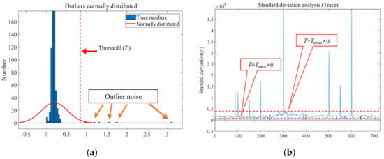 Based on the statistical analysis, we chose the standard deviation σ to identify the outlier traces. For the jth trace, the standard σj can be computed as follows: