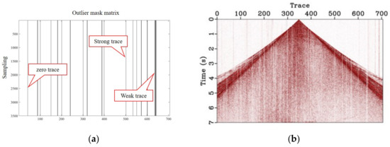The removed outlier trace. (a) Outlier mask matrix (Φt). (b) Data without outlier noise (ds).