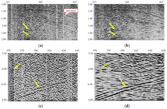 Zoomed sections of the field land data. (a) True data (up). (b) The denoised results using the proposed method. (c) True data (down). (d) The denoised results using the proposed method.