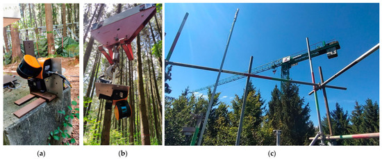 The study area was located in the Kranzberg Forest (48°25′09.8″N; 11°39′39.8″E) in the southern part of Germany, about 35 km northeast of Munich [30]. Within the forest, there is the unique Kranzberg Forest Roof (KROOF) experiment on an area of 0.5 ha [31]. The KROOF experiment was originally designed as a drought stress experiment. In addition to water retention by roofs, a canopy crane had been installed at the KROOF experimental site (Figure 1c). This allows research to be conducted at heights of up to 45 m. In this study, this crane was used to complement the ground scans with scans from above the forest canopy.