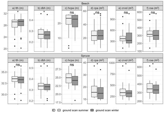Seasonal comparison of single-tree morphologies of beech and spruce (n = 20 for each species). Shown are the total tree height (tth) (a), diameter at breast height (dbh) (b), height of maximum crown projection area (hcpa) (c), maximum crown projection area (cpa) (d), crown volume (crvol) (e) and crown surface area (csa) (f) for ground scans conducted in winter and summer. Asterisks indicate significant differences between scans (*: p ≤ 0.05; ns: p > 0.05).