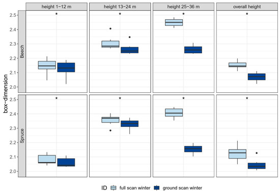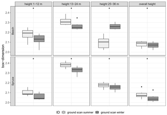 Seasonal comparison of different point cloud sections for the beech and spruce stands across the winter and summer ground scans. The boxplots are based on six circular subplots, each with a radius of 5 m. Shown are the box dimensions for point cloud sections of 1–12 m, 13–24 m and 25–36 m and the total point cloud. Asterisks indicate significant differences between the scans (*: p ≤ 0.05). The resolution of the point cloud was 5 cm.