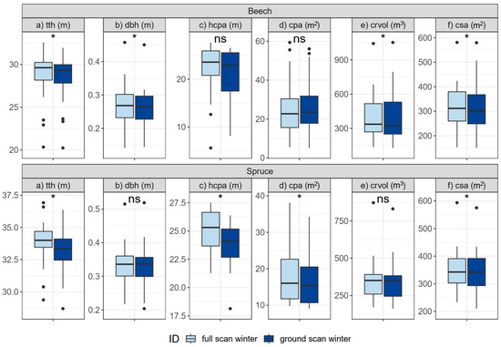 Methodological comparison between the ground scans and full scans conducted in winter of the single-tree morphologies of beech and spruce (n = 20 for each species). Shown are the total tree height (tth) (a), diameter at breast height (dbh) (b), height of maximum crown projection area (hcpa) (c), maximum crown projection area (cpa) (d), crown volume (crvol) (e) and crown surface area (csa) (f) for both winter scans. Asterisks indicate significant differences between the scans (*: p ≤ 0.05; ns: p > 0.05).