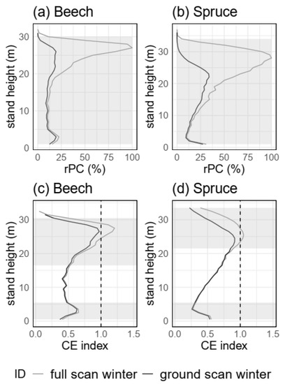 Methodical comparison between the ground scans and full scans conducted in winter for relative point counts (rPC) (a,b) and CE indices (c,d) over the height range. The black curve shows the counts for the ground scan, and the gray curve shows those for the full scan. The curves are based on six circular subplots, each with a radius of 5 m. Shaded in gray is the height range in which the scans differ significantly from each other. The resolution of the point clouds was 5 cm.