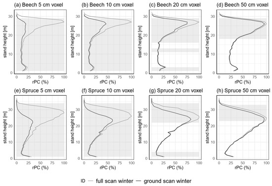 The relative point counts (rPC) with height for beech (a–d) and spruce (e–h) stands for the ground and full scans from winter. The black curve shows the relative counts over the height range for the ground scans, and the gray curve shows those for the full scans. The curves are based on six circular subplots, each with a radius of 5 m. Shaded in gray is the height range in which the scans differ significantly from each other.