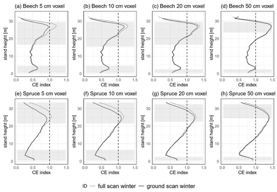 CE indices for beech (a–d) and spruce (e–h) stands for the ground and full scans from winter over the height range. The black curve shows the plot for the ground scan, and the gray curve show the plot for the full scan. The curves are based on six circular subplots, each with a radius of 5 m. Shaded in gray is the height range in which the scans differ significantly from each other.
