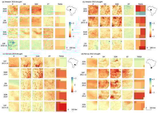 The drought temporal patterns are presented in Table 2, indicating the percentage of the polygon area in each biome that was affected by monthly anomalous values of P, SM, SSM, ET, and TWSA. The results showed how the hydrological variables represented drought in each region, the time lag of the anomalies, in which period the anomalous situation started, and the length of time taken to return to a normal state. On the other hand, Figure 3 represents the drought spatial patterns focusing on the temporal effects of the phenomenon.