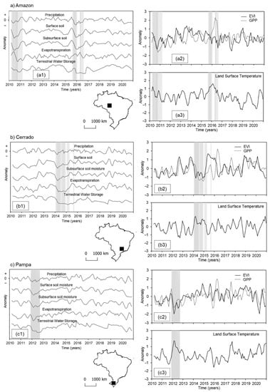 Temporal drought patterns (2010 to 2020) for analyzed variables in the three Brazilian study areas: (a) the Amazon, (b) Cerrado and (c) Pampa; being (a1), (b1), and (c1) for P, SM, SSM, ET, and TWSA; (a2), (b2), (c2) for EVI and GPP; and (a3), (b3), and (c3) for LST. The hatched area represents z-score ≤ −0.5 verified in dry periods with long effect in the analyzed variables (approximately 2010 and 2015 for the Amazon, 2014 for the Cerrado, and 2012 for the Pampa).