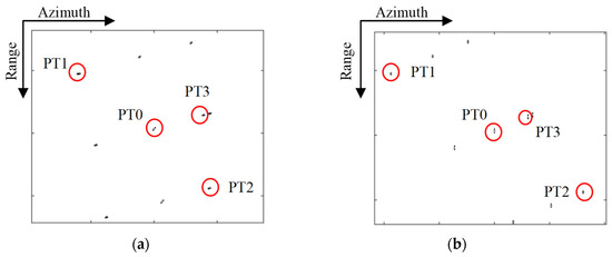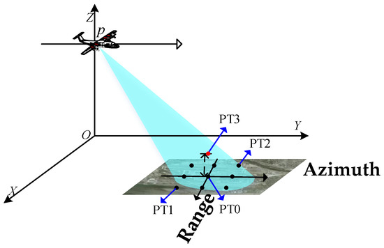 Simulated data were used to verify the effectiveness of the proposed approach. A 3 × 3 dot matrix was set in the simulated scene, with central target PT0 as the reference target. A point target PT3, indicated by the red dot, is at a 0.2 km altitude, with the same coordinates in the horizontal plane as PT0. The scene geometry is displayed in Figure 6, with a scene size of 2 km × 2 km, and Table 1 summarizes the simulation parameters.