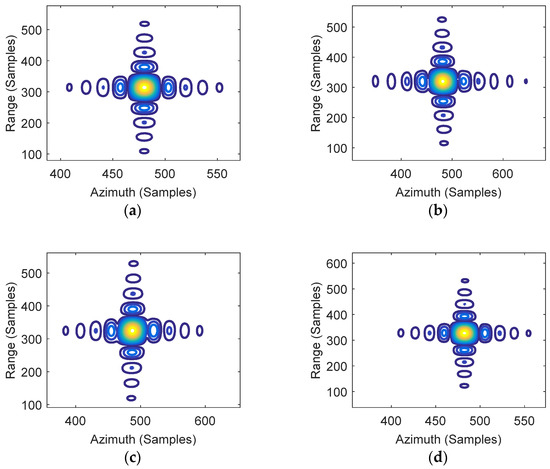 Figure 7 presents the image results for the entire target area using the CPFA and EPFA. The focusing results for point targets PT0, PT1, PT2, and PT3 are marked by red circles. To further assess the performance of the proposed algorithm, a comparative analysis was then carried out. The contour plots for the impulse response function (IRF) of the four targets are shown in Figure 8 and Figure 9.