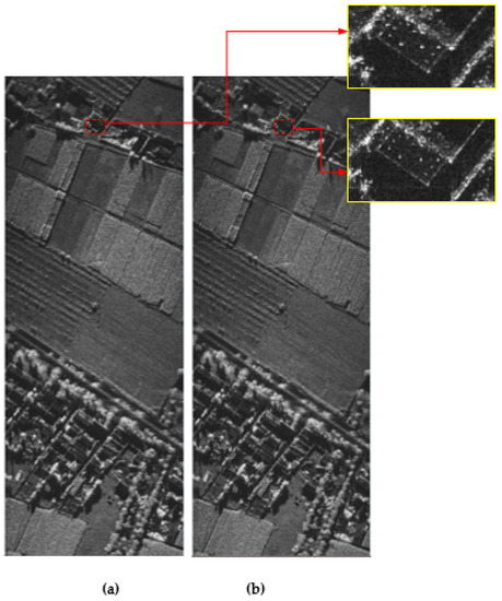 Real data from an experimental X-band SAR were processed using the EPFA and CPFA for comparative analysis. The platform speed was 32 m/s, the trajectory height was approximately 1500 m, the squint angle was 49°, the transmitted signal bandwidth was 800 MHz, and the azimuth resolution was 0.3 m. Figure 10 shows the experimental results for the CPFA and EPFA.