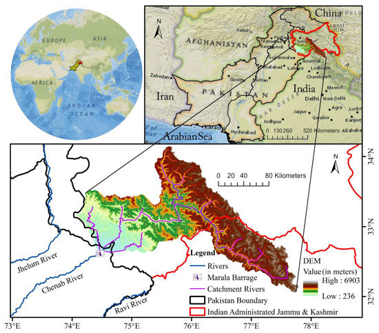 The Chenab River is one of the main eastern tributaries of the Indus River, which originates from the state of Himachal Pradesh in India and moves in the southwest direction towards Pakistan. It has a steep slope (25 m/km) in upstream snowy parts and a less steep slope (0.4 m/km) in the downstream plains of Punjab, Pakistan [59]. It has a first discharge gauging site at Marala Barrage in Pakistan. The Chenab River Basin (CRB), above the Marala Barrage, is a shared transboundary catchment between India and Pakistan, with 97% of the area on the Indian side. The elevation of the CRB ranges from 236 m to 6903 m (Figure 1). The total area of the CRB, above Marala Barrage, is about 28,000 km2 and extends between 32°–34.3°N and 74°–77.85°E, as shown in Figure 1.