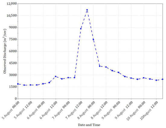 The river flow data were obtained from Flood Forecasting Division, Pakistan Meteorological Department. Flow data were recorded every 6 h (at 00 h, 06 h, 12 h, and 18 h) during the monsoon season (15 June–15 September) at the first discharge gauging site, i.e., Marala Barrage, which is also known as the first rim station in Pakistan. The 2016 flood peak data were obtained and used to calibrate and validate the hydrologic model (Figure 2).