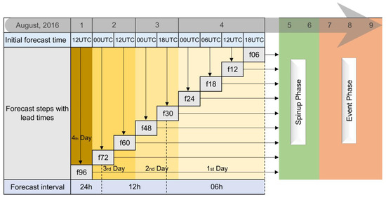 In the WRF pre-processing system, GFS data were interpolated onto the WRF grid. It has to be noted that GFS precipitation was not input to WRF, as it was solely derived by WRF physics and parametrizations itself. According to the objective of this study, to investigate the effect of lead time on NWP, GFS data with nine different lead times of up to 96 h were supplied to the WRF model to generate the precipitation forecasts, i.e., f06, f12, f18, f24, f30, f48, f60, f72, and f96. Forecast f06 means that the starting date and time of data acquisition was the 4th August 18 UTC, with the other terms following the same scheme (Figure 3). According to Figure 3, the 5th and 6th of August were considered to be the spin-up phase for the model to stabilize it, while the 7th to 9th were termed the event phase. Outcomes from every forecast run of the WRF model were converted into .asc files with Python routines for further use in the hydrological model.