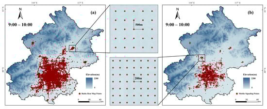 Vector point display of Baidu heat map data (a) and mobile signaling data (b).