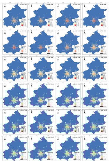 Based on the preprocessed correlation dataset and our proposed spatial downscaling framework during work time and sleep time, we spatially downscaled the Baidu heat map data for a total of 24 time periods in Beijing on 17 August 2022, and mapped the population density distribution with high spatiotemporal resolution (i.e., hourly, 100 m). The spatiotemporal patterns of the population show significant fluctuations between sleep time and work time, as shown in Figure 4 and Figure 5. During sleep time (i.e., 0:00–7:00), the population exhibits a high concentration, resulting in many areas with high population density and weak changes in the spatial distribution of population density during this period, which indicates a low intensity of population mobility. During work time (i.e., 7:00–24:00), it can be seen that the population is relatively dispersed, with a significant decrease in the number of areas with high population density, and the spatial distribution of population density changes significantly over time (e.g., significant changes in traffic flow), which indicates strong population mobility during this period. Overall, the high spatial and temporal resolution population distribution maps generated based on our proposed spatial downscaling framework can adequately capture the spatial heterogeneity of the population and the difference between sleep time and work time.