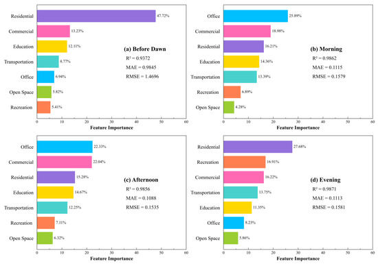 We used the KDE method to calculate the density of POI for seven functional types on a 100 m grid to reflect the percentage of different land use types. For convenience of processing, the population density distribution maps from 0:00 to 24:00 were divided into four time periods, i.e., 0:00–7:00 (before dawn), 7:00–13:00 (morning), 13:00–18:00 (afternoon), and 18:00–24:00 (evening), and we averaged the population density distribution maps for the four time periods. Then, we input the POI density of the seven functional types as the independent variable and the average population density as the dependent variable into the random forest model for fitting. After developing the RF model, each predictor variable had an output value (i.e., feature importance), indicating the contribution of the predictor variable to the target variable [34,64]. Finally, we used the feature importance to analyze the relationship between population density distribution and land use types at different time periods of a regular weekday. Figure 8 shows the results of the fitting accuracy and feature importance assessment.