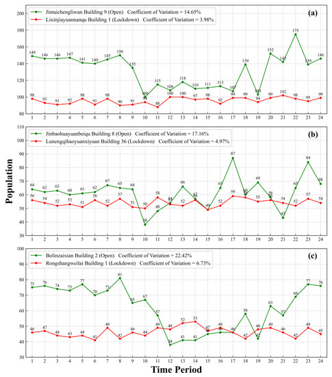 We summarized the raster values of the 100 m grid to which the buildings belonged and drew line graphs. Figure 9 shows the population mobility over time of the three high-risk buildings and three low-risk buildings. From the perspective of coefficient of variation, the population mobility intensity of the three high-risk buildings is very low, while the population mobility intensity of the corresponding three low-risk buildings is relatively high. This indicates that the high-risk buildings are in a lockdown state, strictly limiting the movement of the population, while the low-risk buildings are in an open state that the population can access freely. It is worth noting that the population of high-risk buildings fluctuates significantly during certain time periods. We believe that this phenomenon may be due to medical staff coming to perform nucleic acid testing, people from low- and medium-risk buildings in the same residential compound entering the vicinity of high-risk buildings, or because of the sampling bias of Baidu’s heat map data [7,8,48,58,61]. Overall, our results demonstrate the strong execution of China’s “surgical control and dynamic zero COVID-19” epidemic prevention and control policy. It was the superiority of that policy that safeguarded the lives and health of the Chinese people and liberated their freedom to the greatest extent possible.