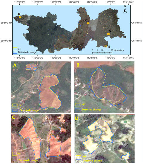 Statistical analysis results indicate that the forest loss area detected by GFC-V1.8 in the Hengyang City is 6.05 km2, which is significantly lower than the GT (9.43 km2), while the total deforestation area detected by SiamHRnet-OCR is 11.24 km2, which is slightly larger than the GT. There are three possible reasons to explain this difference: (1) GFC-V1.8 was produced on 30 m Landsat imagery, which is a relatively coarse spatial resolution, and may be not suitable for high-precision deforestation detection; (2) some deforestation regions with slight spectral change cannot be captured by GFC-V1.8; and (3) a few commission errors were produced by the SiamHRnet-OCR, e.g. water changing into bare land was regarded as deforestation.