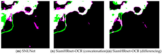 Figure 12j,m, both STAnet and SNUnet achieve relatively good results, but a few omission alarms are still produced in the boundary of change regions of these two methods, especially in the “pseudo-change” regions. As a whole, visually, both SiamHRnet-OCR (concatenation) and SiamHRnet-OCR (differencing) achieved better results than all other models. Additionally, it seems that deforestation detection results based on the SiamHRnet-OCR (differencing) model achieved better visual effects than the SiamHRnet-OCR (concatenation) model, such as in the edge of deforestation regions.